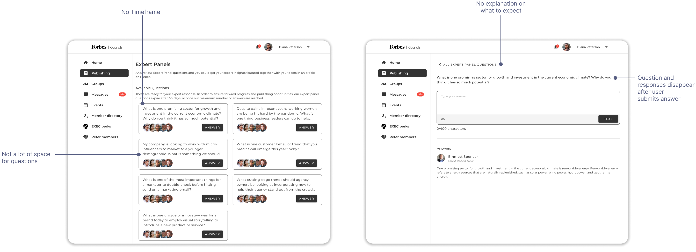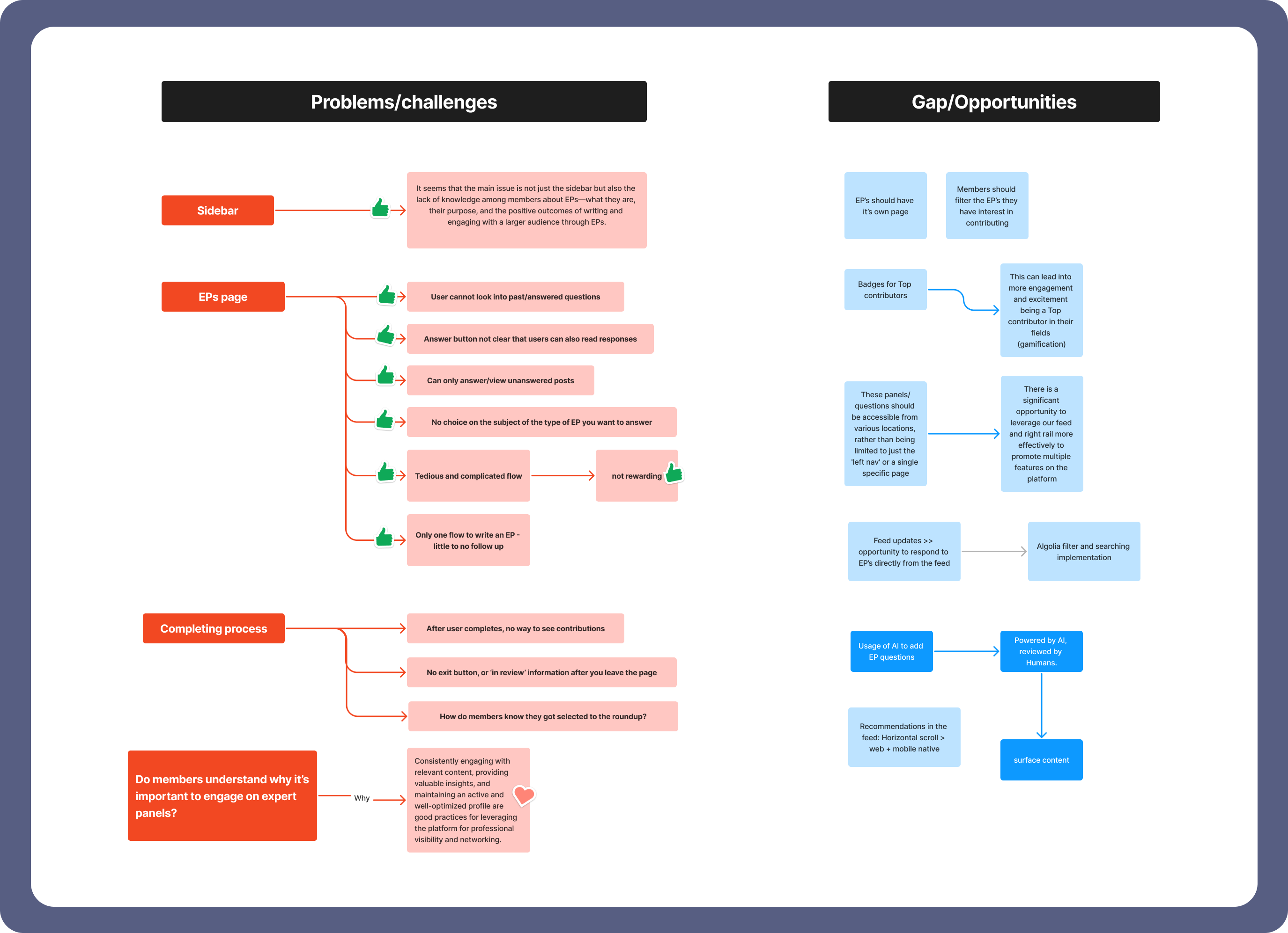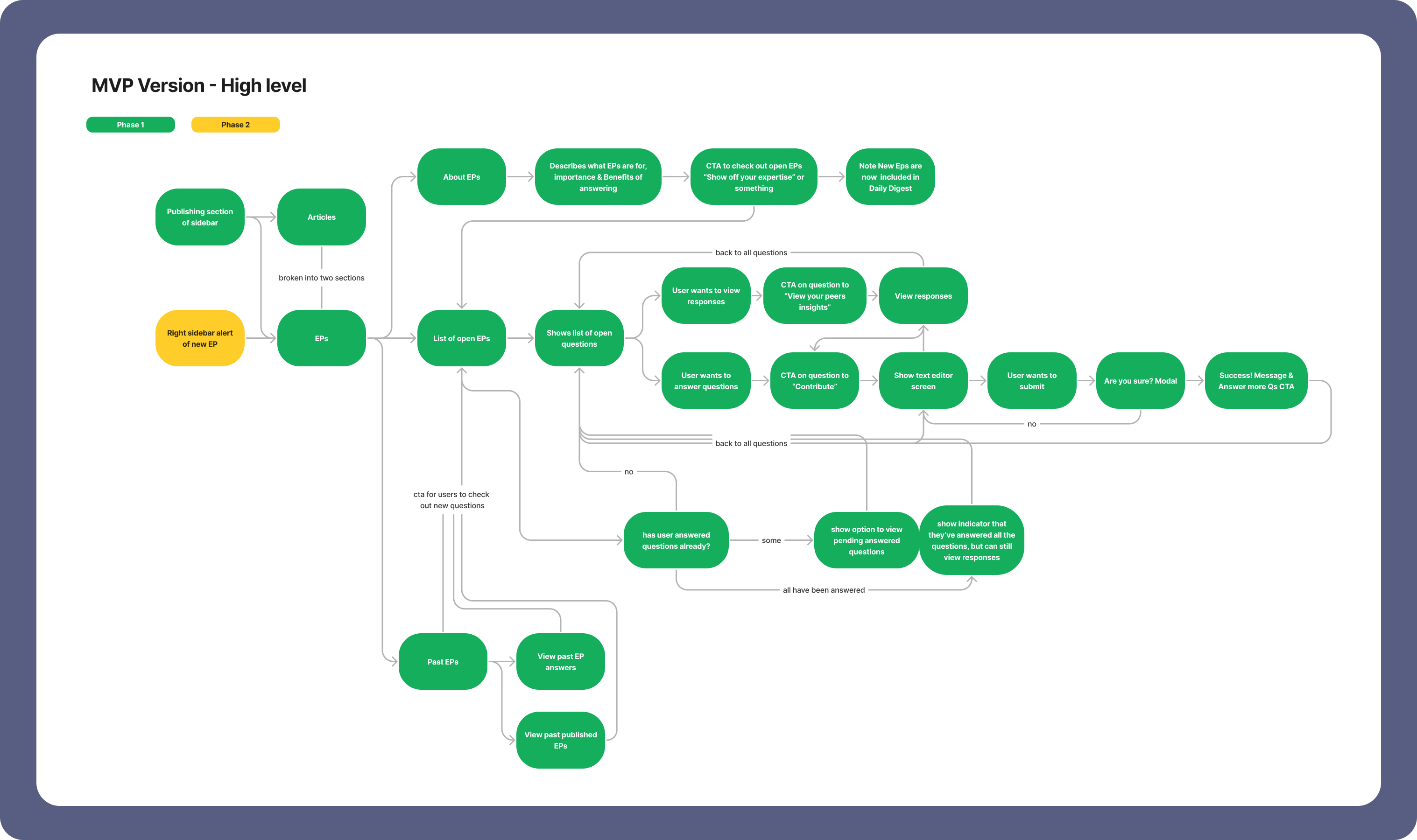 A simple but dated flow, it started by dropping the user on the Publishing page, where they needed to identify and click into the EPs section. From there, they could select a question to answer. However, there was no additional information about the questions: no information about the date posted, how long it had been open for, and if it was going to close soon and users would be unable to submit their input. Once the user clicked into a question, they could view other user’s responses and answer themselves, but when they tried to answer, the other responses would disappear - our data found that many users dropped off at this point, as they wanted to read their peer’s input. Once their answer was submitted, the question would disappear completely, responses and all. This was a major pain point for users - many reached out and requested a way to see their peer’s responses after their own submission, and some waited until what they thought was the last day to submit because of this. The users were under the impression that questions operated on a monthly release and close cycle, but questions often closed when they reached a certain amount of responses too.