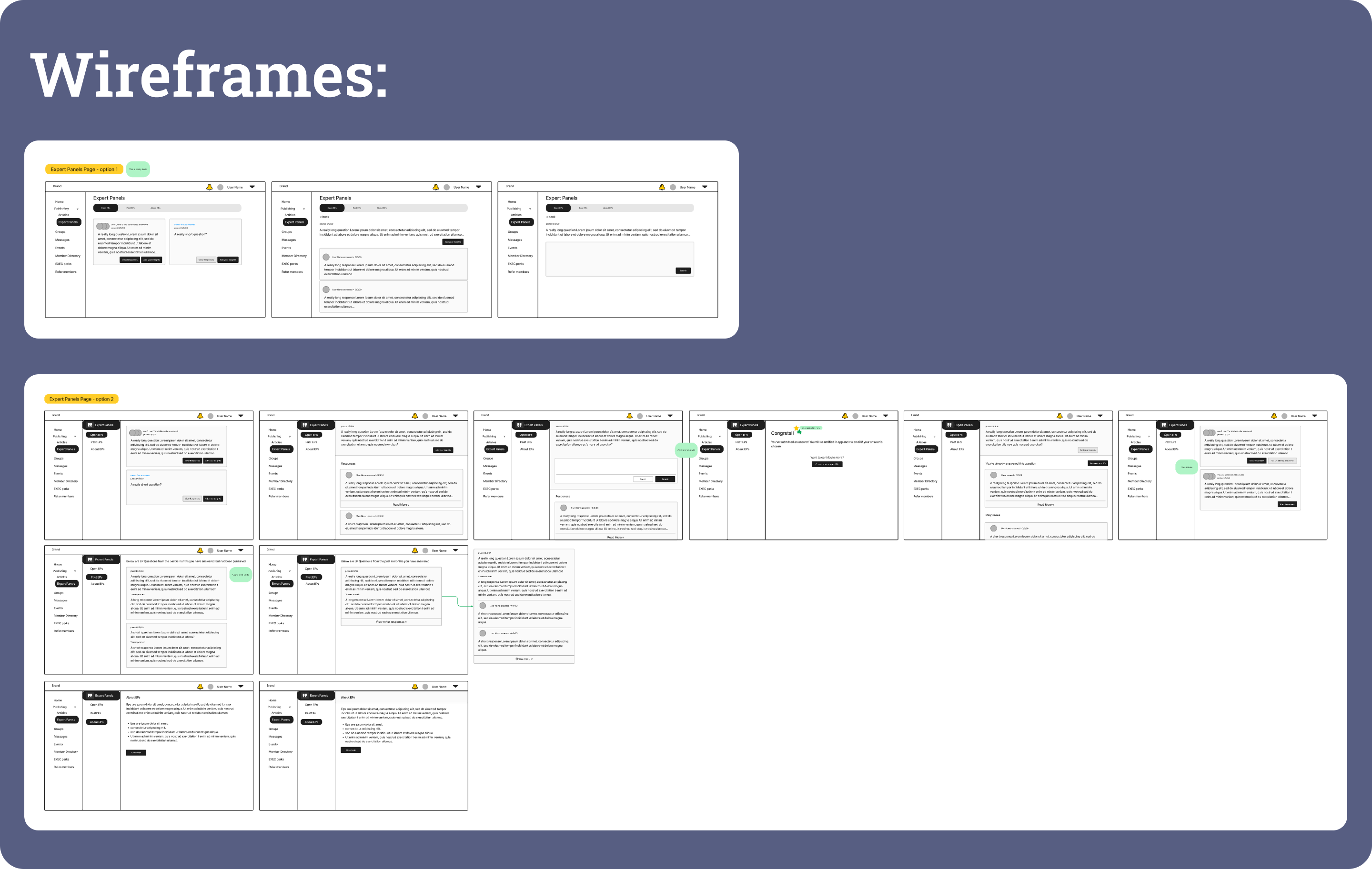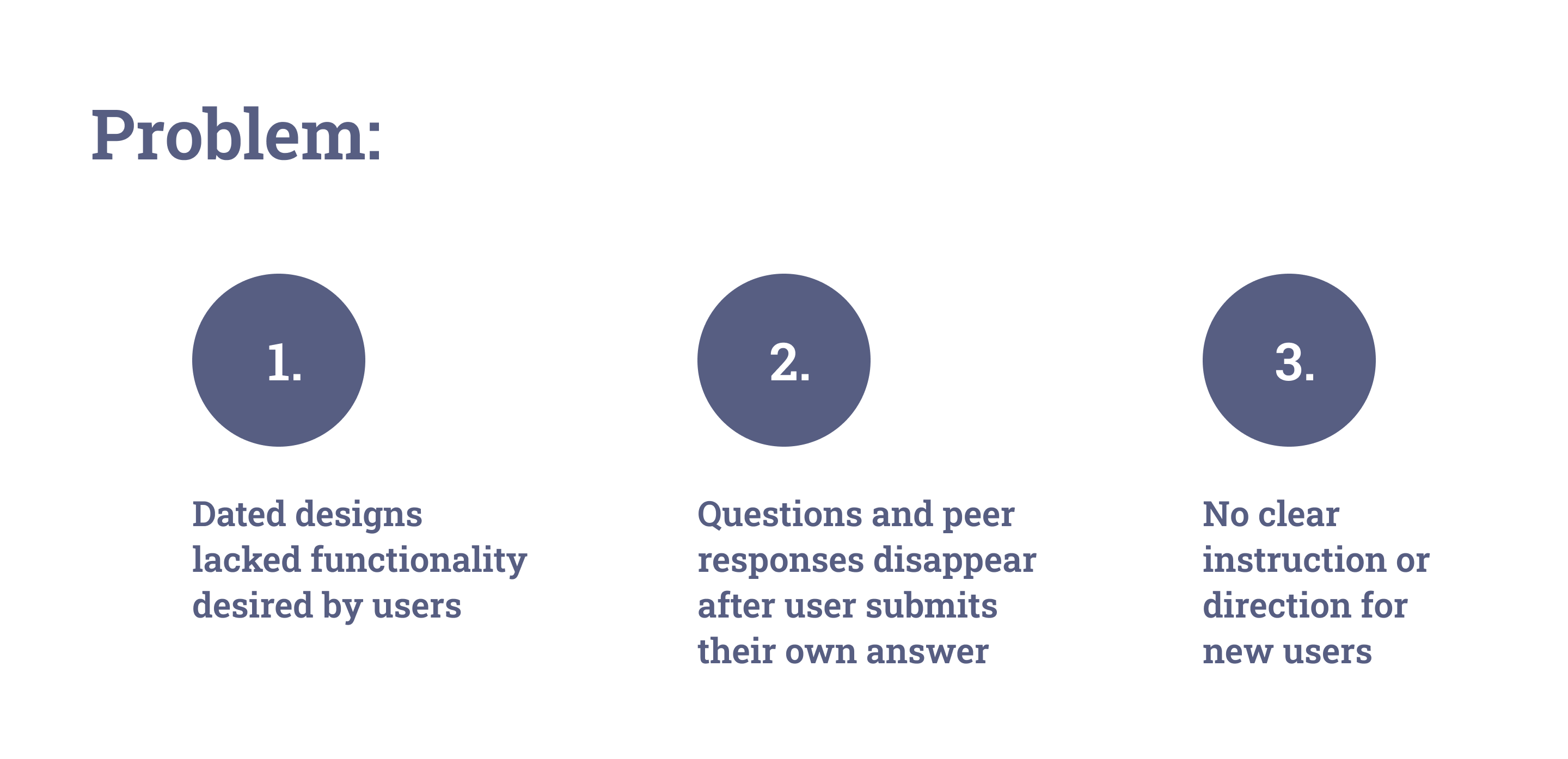 We started with our own review of the current flow, one designed before both of our times at the company started, and then dug into user testimonies to see their thoughts. For the most part, the users agreed with our identified pain points, and even gave us some ideas on where to further improve as well. They suggested clarity for the process, as well as being able to see answered questions and access to their peer’s answers as well, as the users wanted to interact with and support answers they liked.