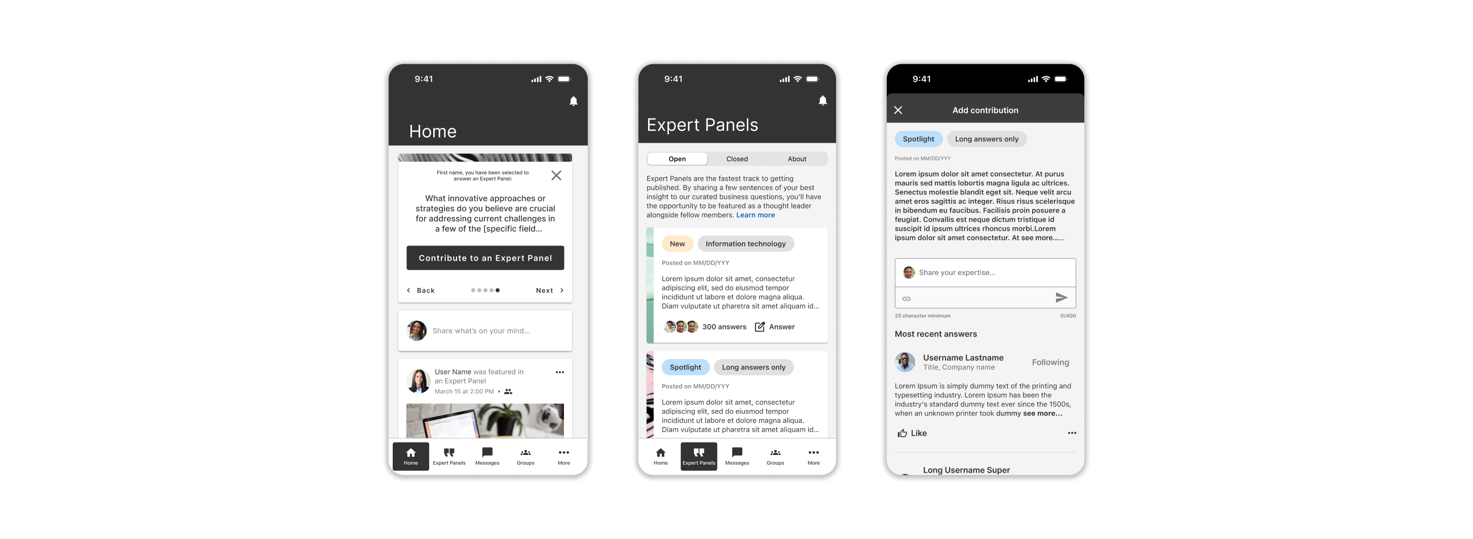 In addition to the users themselves, we did a lot of external research on similar platforms and how their userflows went. This project started right as LinkedIn’s collaborative articles were released to the public, so we of course looked into their designs. Additionally, sites like Quora, Reddit, and others that dealt with question and answer or publishing flows were added to our giant research board. We went through all the flows with a fine toothed comb - inspecting what worked, what didn't, what we were missing from our own flows. After we felt that we had enough to get started, we reviewed our findings with our stakeholders, got approval, and then jumped into the wireframes process.