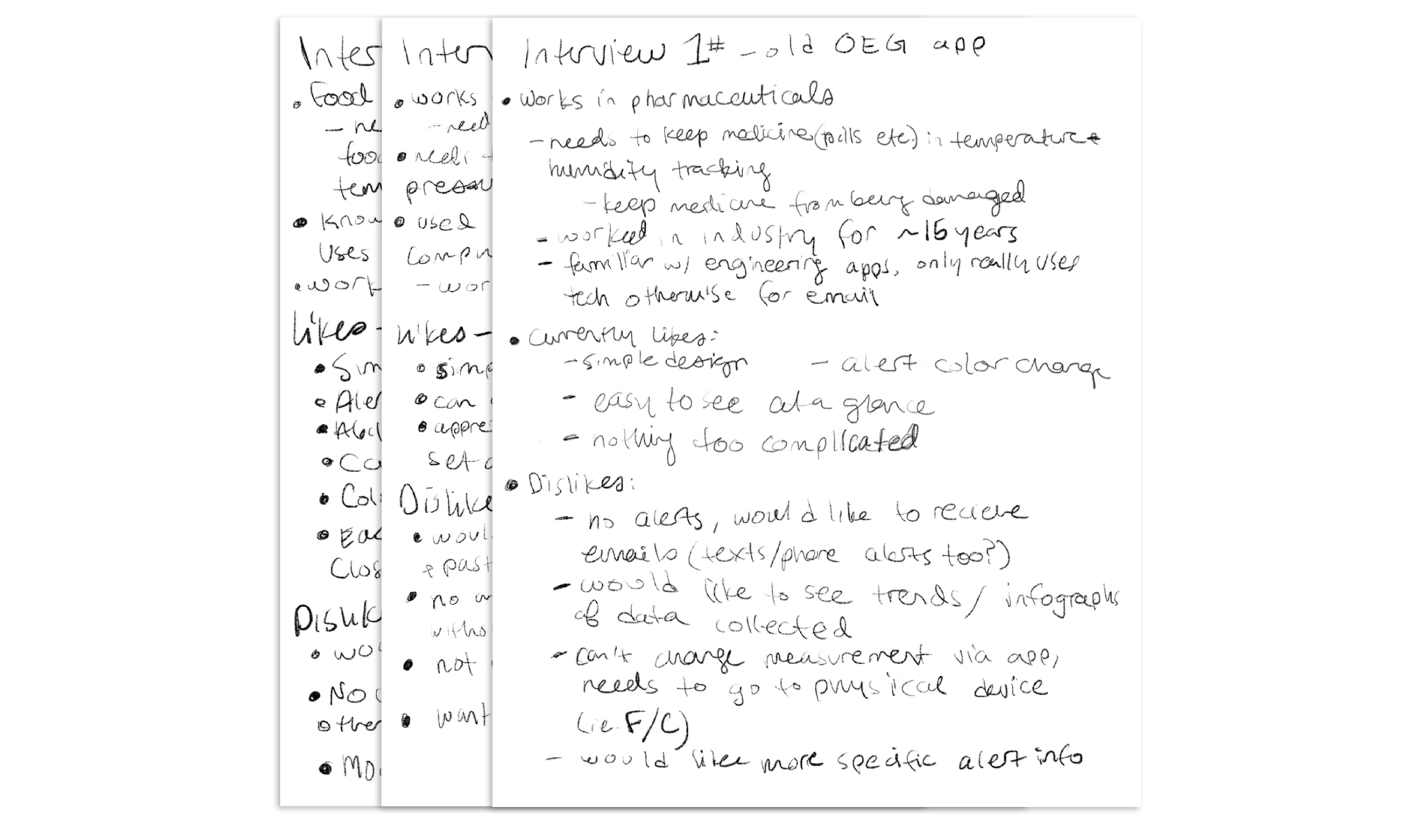 To collect information on what the users wanted, we started by reached out to several long term customers. Quite a few were users of the OEG app and volunteered to walk us through how they used it, what they liked and didn’t like, and what they would like for an updated app. Additionally, we asked them about why they were using the app, their proficiency with different technology, which industry they worked in and how long they had been in the industry. We scheduled the first round in early december and interviewed around 10 different users from a variety of industries and used the information we gathered to help inform the first rounds of prototypes.
