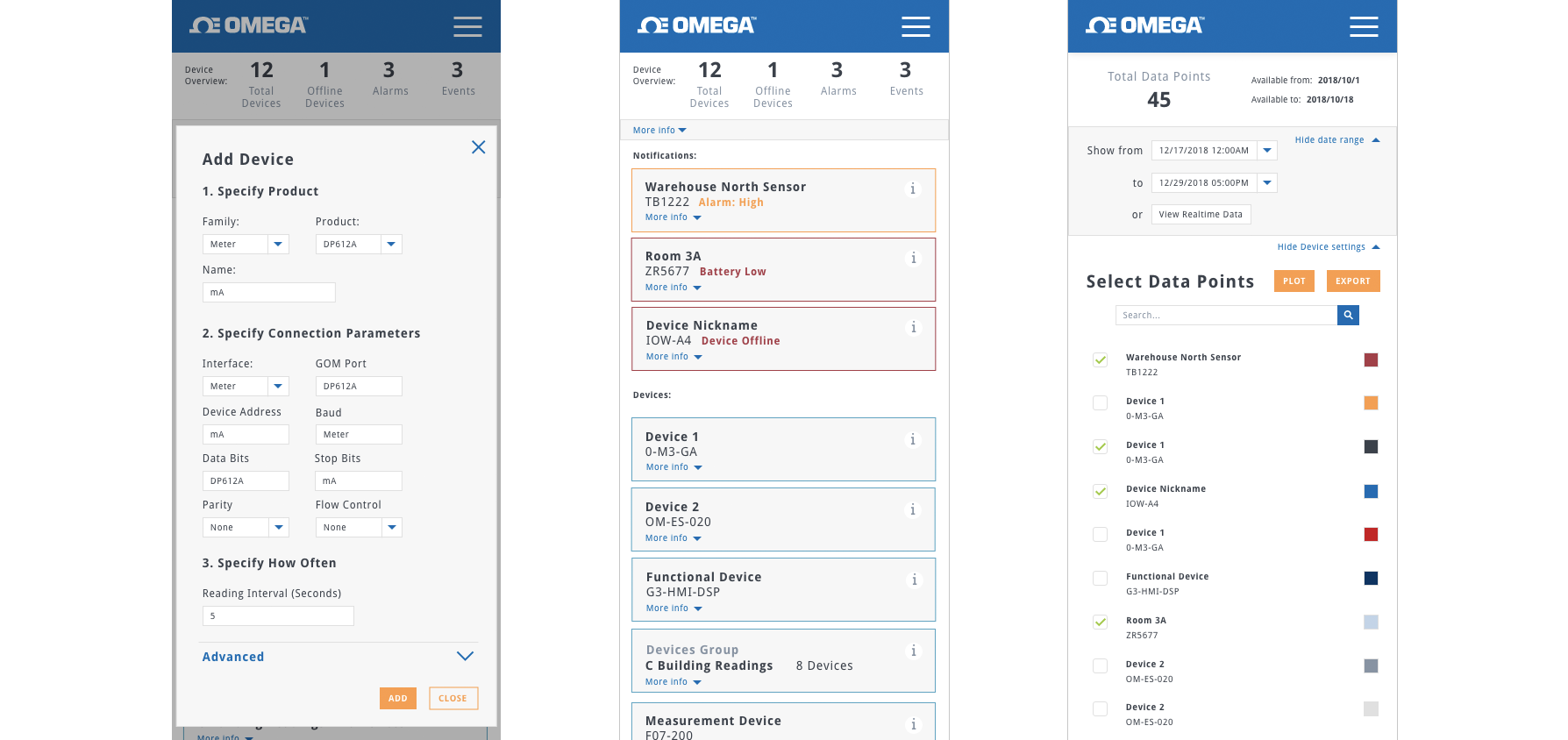 The OEG app, or Omega Enterprise Gateway, is an app to link Omega Engineering's many devices and tech to one app and monitor all the collected data at once. The original app had last been updated years before, about 10 years before in 2008, and was in great need for an upgrade. This new version would need a lot of research and a new UI to match the (at the time) newly updated Omega website and branding.