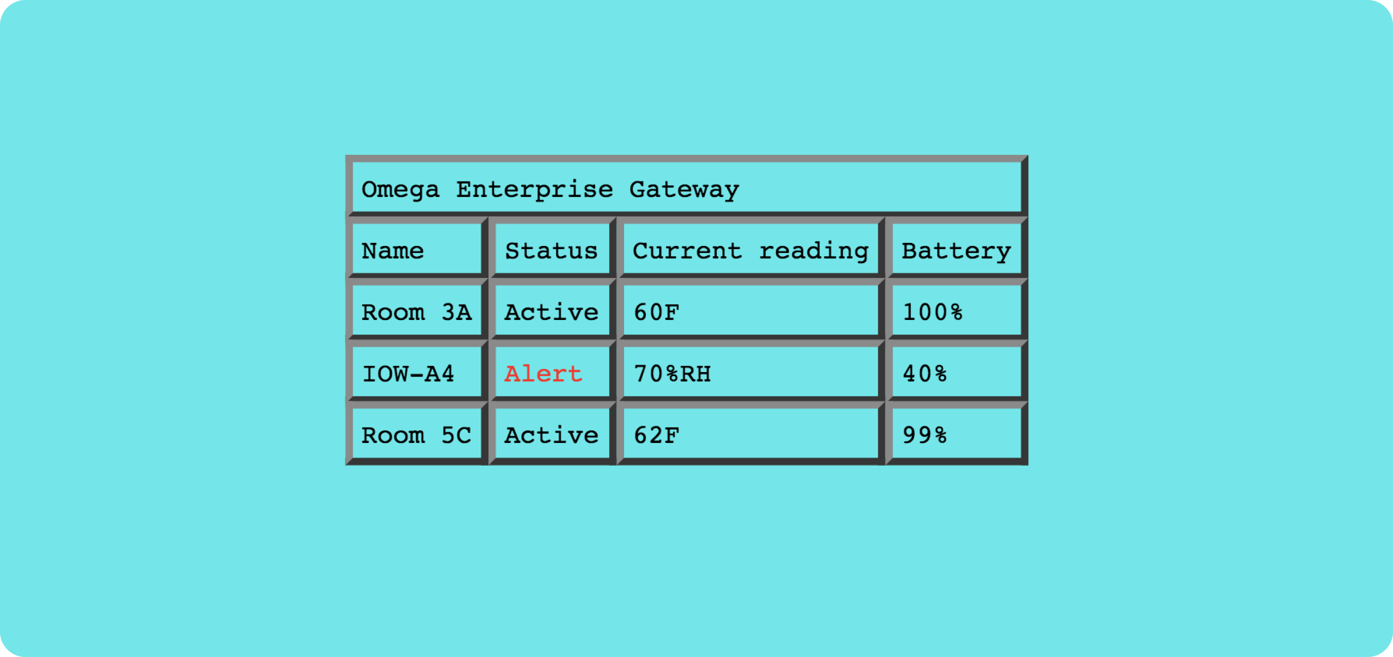To start off, we checked out what the old app looked like. It was only available for the web, and appeared like a basic HTML table with a cyan-ish background. The only other color was red, for when a device had an issue that needed attention. As it was, there were no brand colors, no Omega logo. There was minimal data and each device could only read for one measurement type at a time. Additionally, most of the device information could only be changed by accessing the physical device and changing the info there. Below is an image of the app before the redesign.