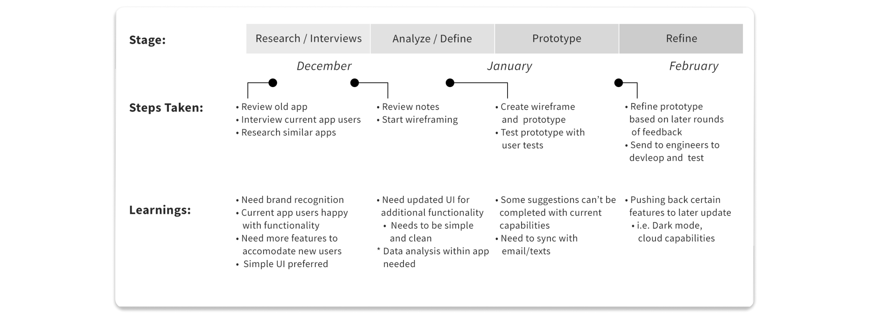 For the design and research phase, we were only given about three months to define the problem and create solutions to make the new app a much more robust and functional experience for the users. First, we had to figure out how much time was enough to figure out what to do with the app, design it, and test it. Since we wanted to incorporate User Interviews and get actual users of the app to help us understand what they wanted, we dedicated almost the entire full month to setting up interviews and meeting with the users. The second and third months were split between reviewing and revising the wireframes and prototypes and testing them with users to see how they liked the design.