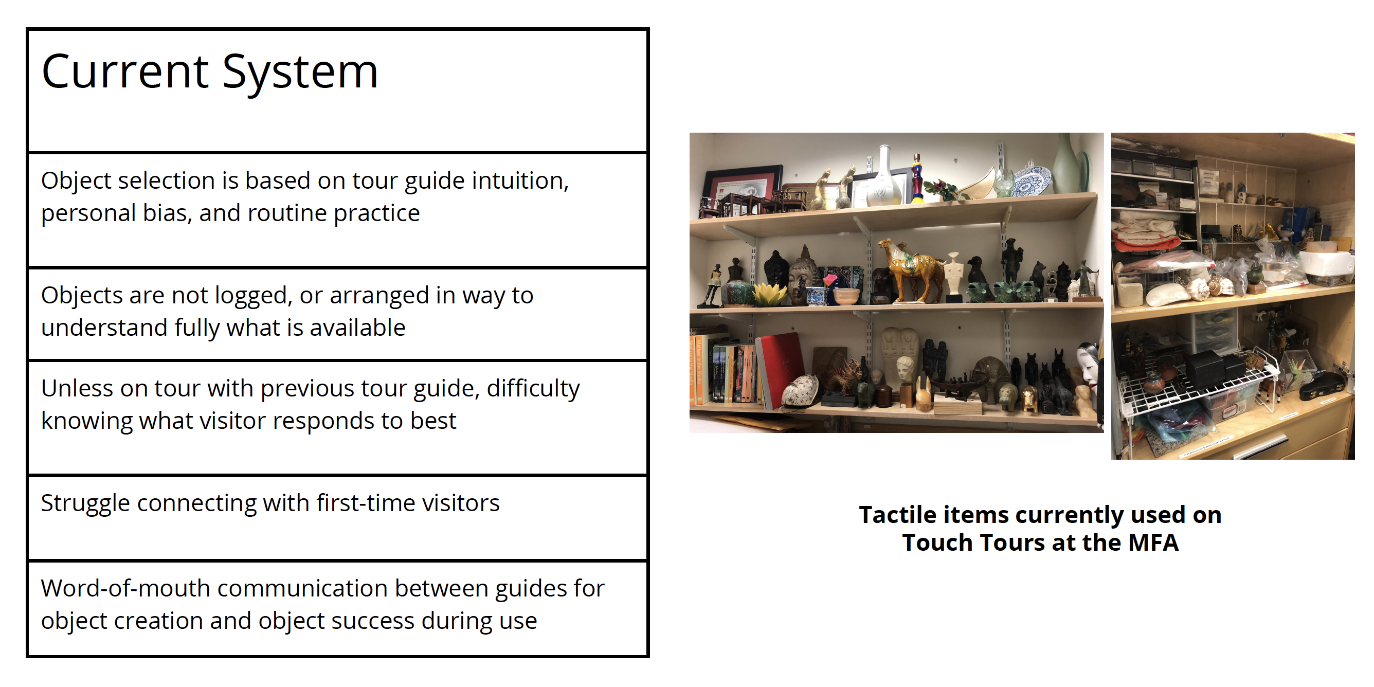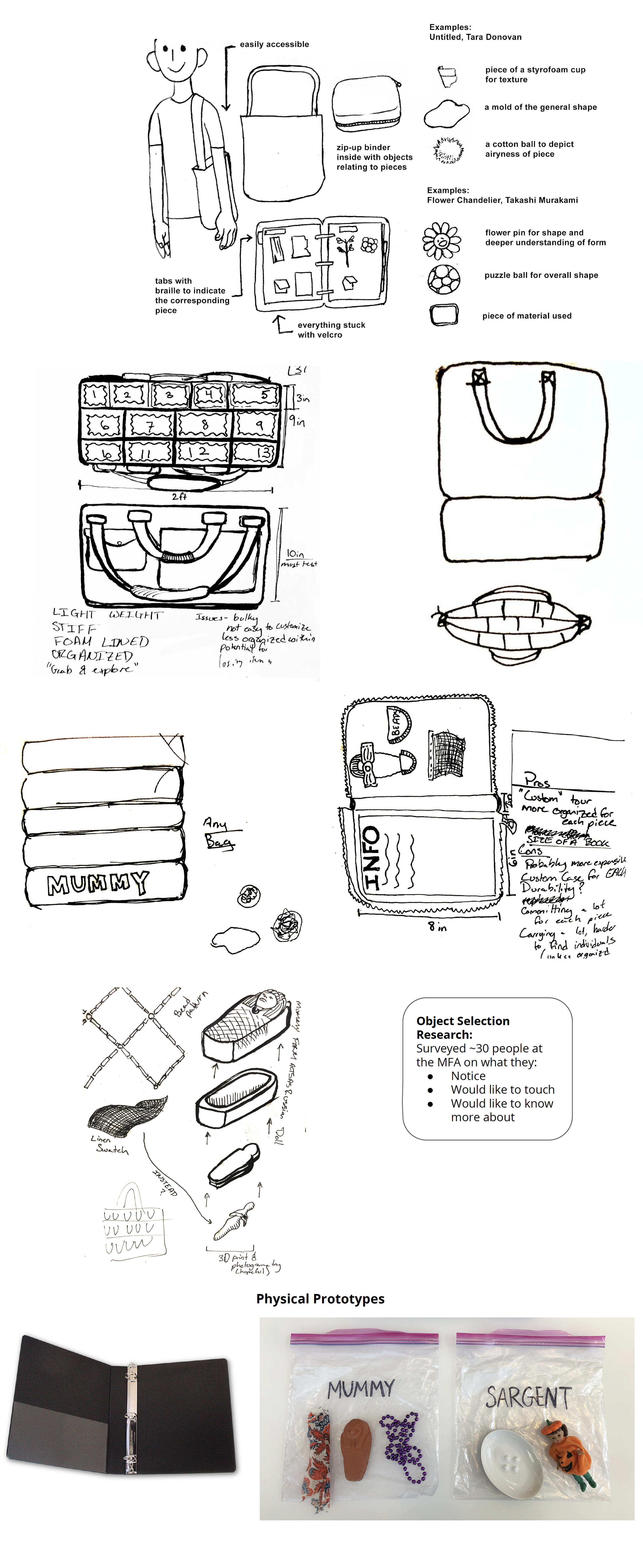 First off, we have the Tactile Tote enhancements. We proposed the idea of the guides carrying around bags with different objects inside, but that was already being implemented by mfa workers. Many of them were creating their own objects and bringing them in so visually impaired guests can get a feel for the pieces (pun intended). The system, however, operated mostly by word of mouth where a guide would tell others about different objects and that was the only method of the information getting around. In addition to creating an organizational system, we also prototyped a bag redesign to help brand the tours better and make sure the objects stay safe to increase their longevity.
