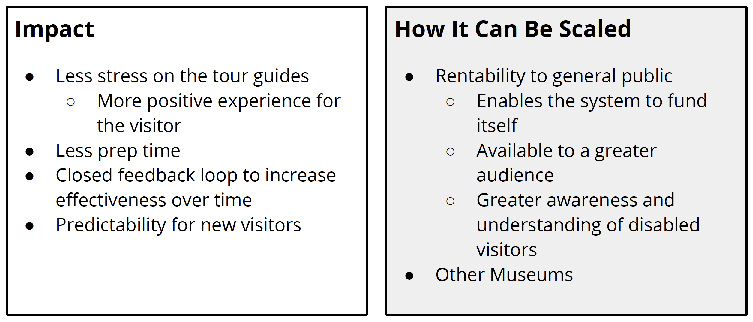 Overall, our project would make a tour guide, and a guest's, experience run much more smoothly and the costs would leave tens of thousands of dollars left to spare.