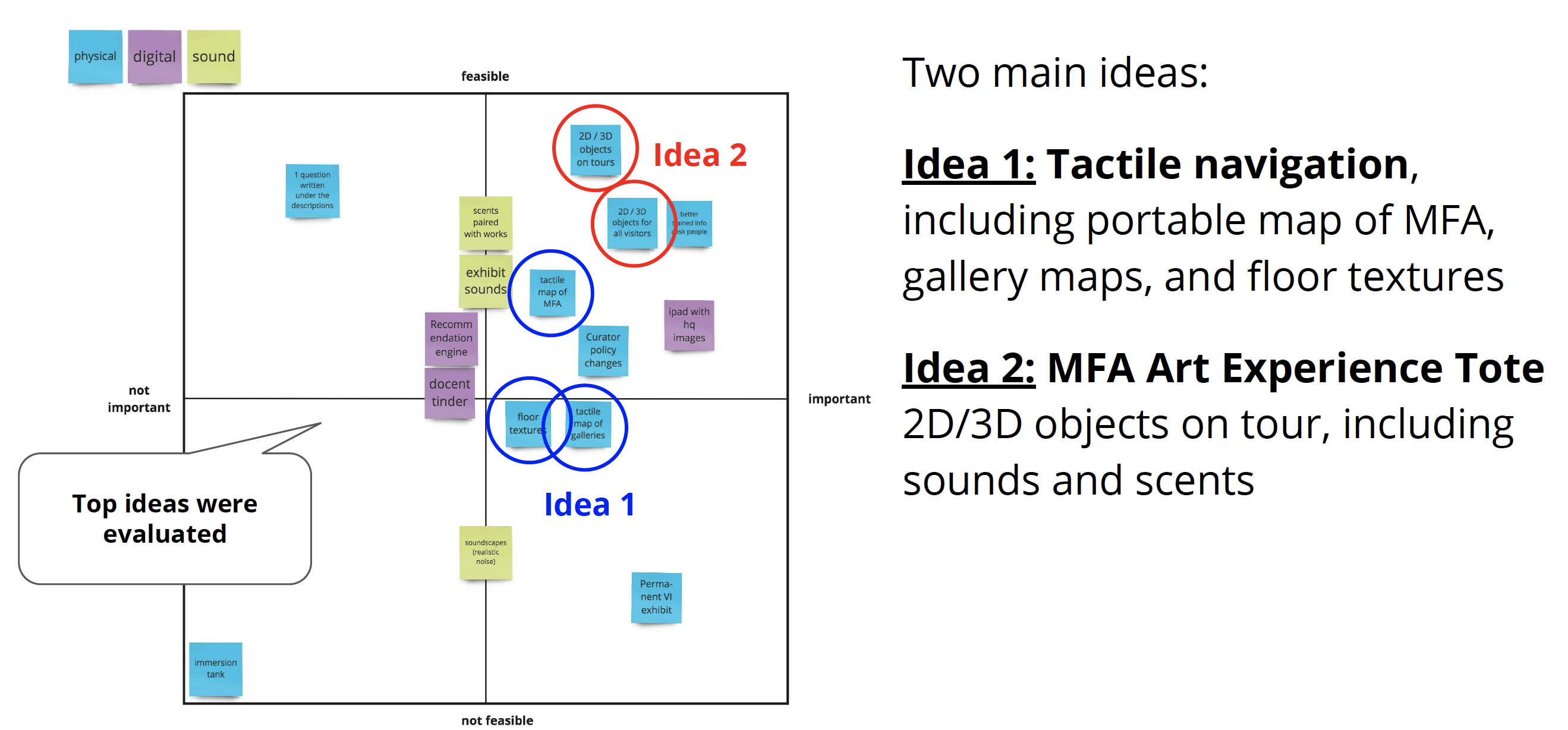 With the prompt and goal of enhancing the experience for visually impaired guests in the renowned art museum, myself and fellow students Olivia Martinez, Isabelle deMetz and Steven Meyer got to work. The next steps in the process were to figure out the more specific problems we were trying to solve. What we understood was that visually impaired people were fairly satisfied with the museum experience, so we had to find a way to make even it better. What was supposed to be one solution turned into three, and they ended up being beneficial to way more than just our target stakeholders.