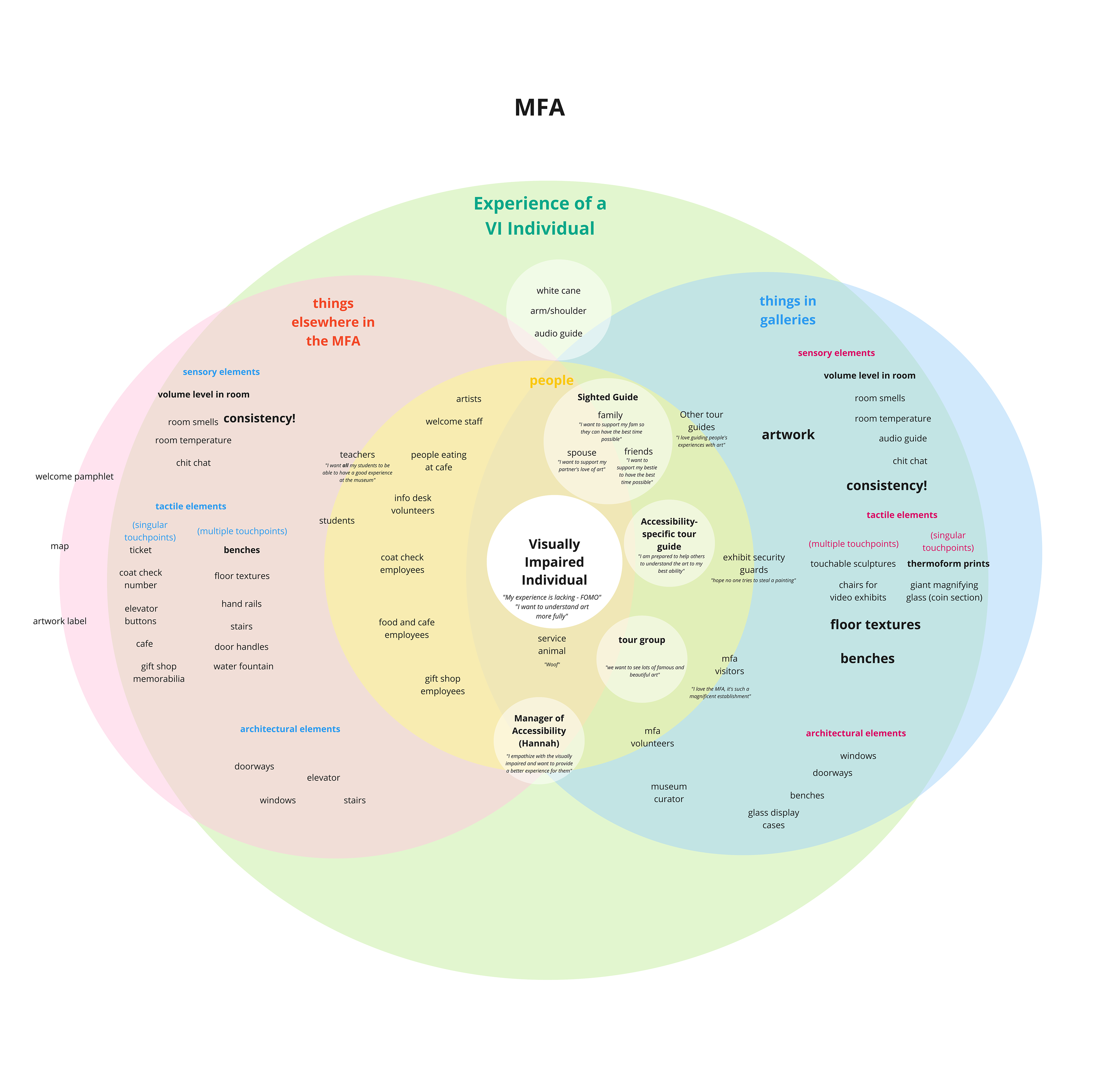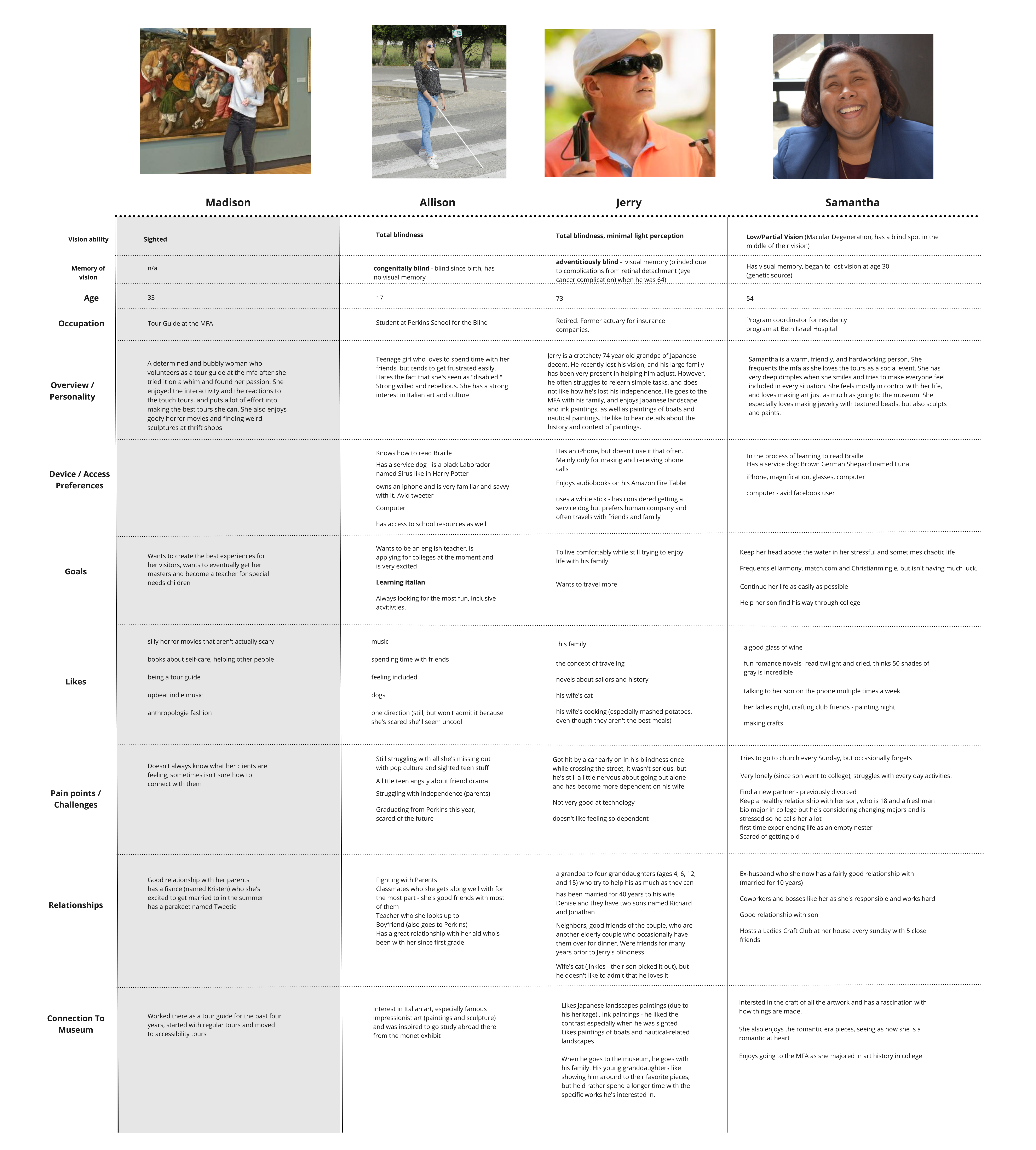 Initially, we developed three personas to help us develop what we needed for the solution. All three were visually impaired, with varying degrees of sight and age (and hobbies, personal lives, etc). In the latter half of the project, we added in Madison, a tour guide for visually impaired guests at the mfa. We wanted to cover all bases for guests, and then expanded towards those who would be using the system behind the scenes as well as on the front side.