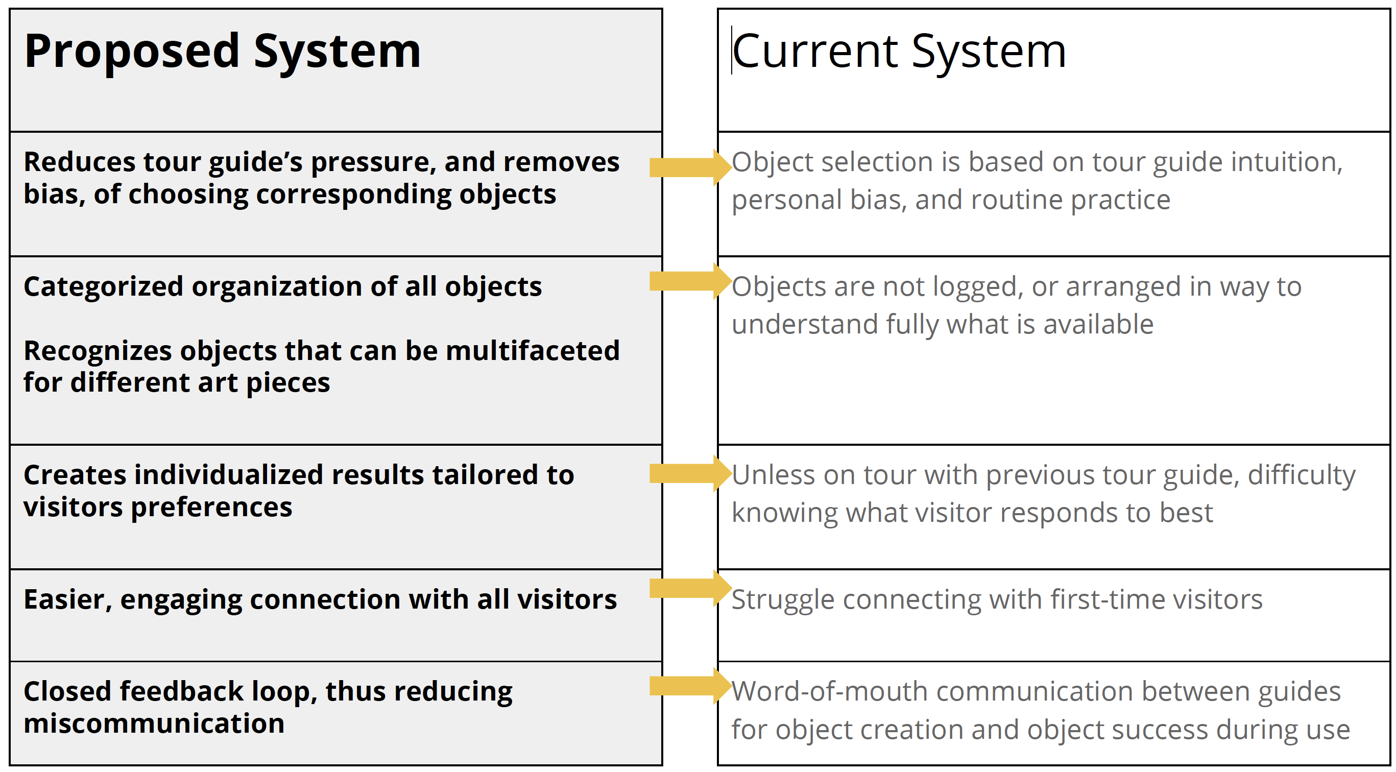 Our final proposal was database / application for accessibility tour guides to select objects that will help VI visitors to experience artworks more deeply. The following diagrams describe the current system and how our proposed system would enhance the overall system.