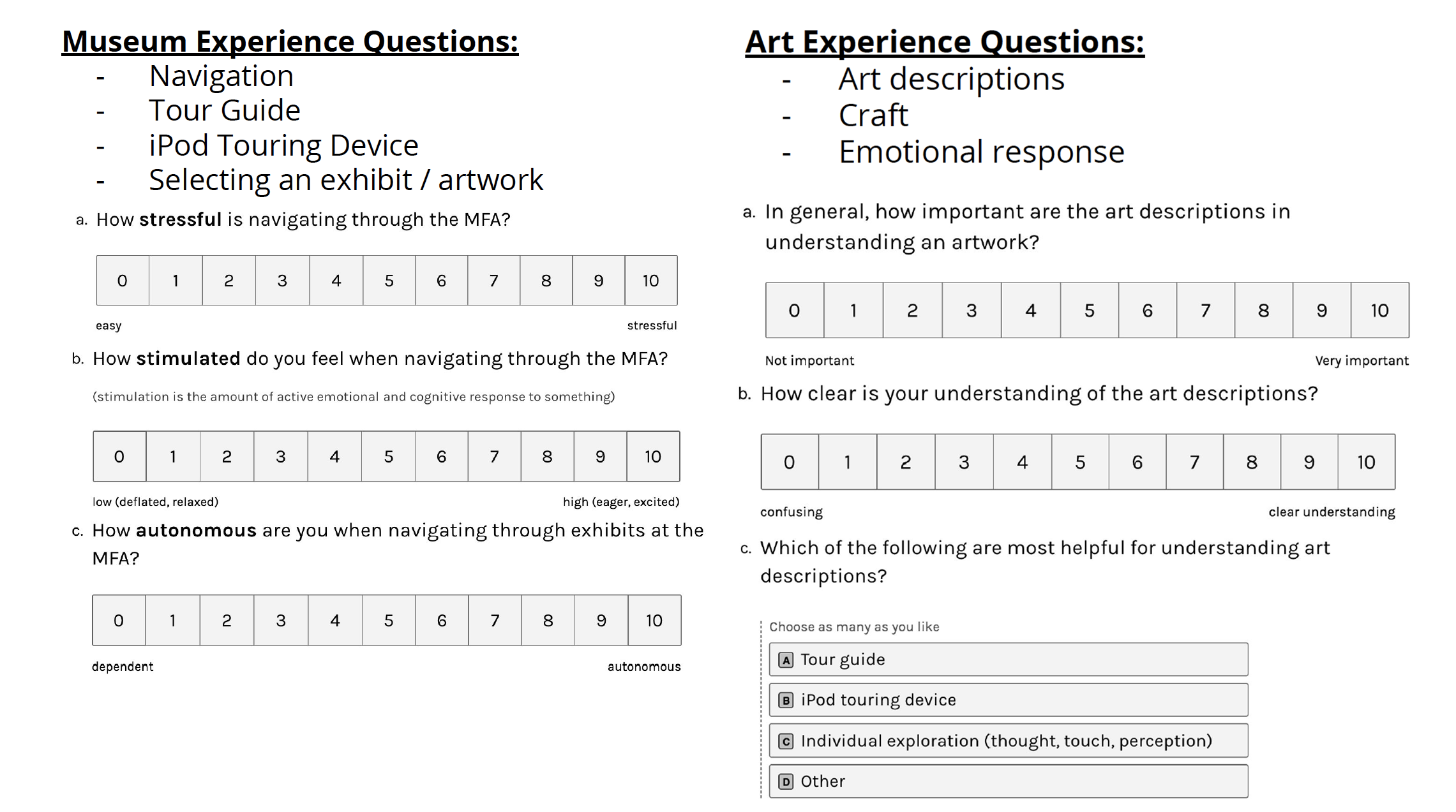 Lastly, we have the survey questions, sent out to mfa guests who had taken the tours before. Unfortunately, we didn't get sufficient results to form any conclusive data, but below are the questions we formed to ask.