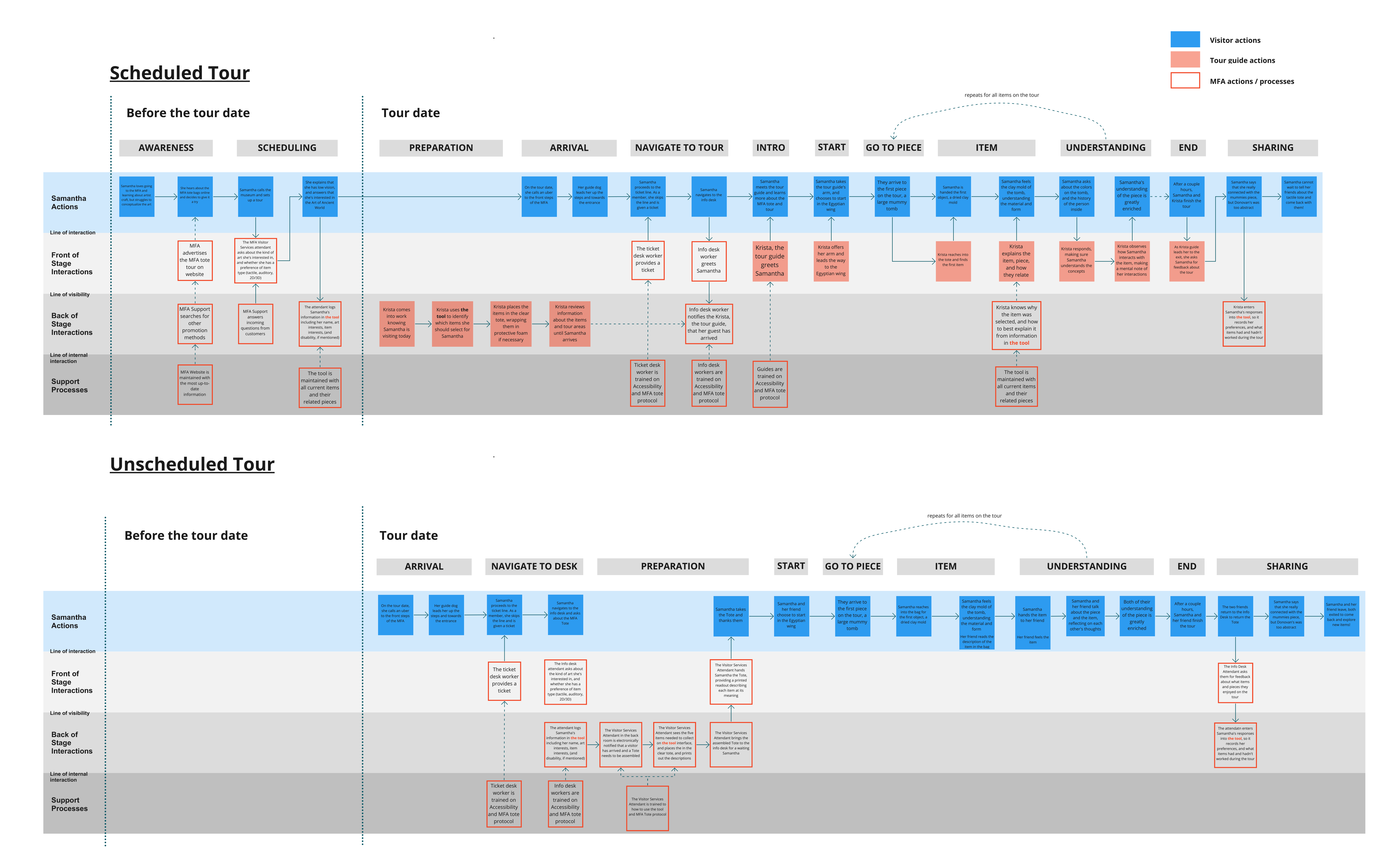 To illustrate how these bags would be implemented in the museum, we created service blueprints to show the front and back-end of how the tours would work with our enhancements. Below that is also a storyboard, for those who would want a more narrative rendering of the experience.