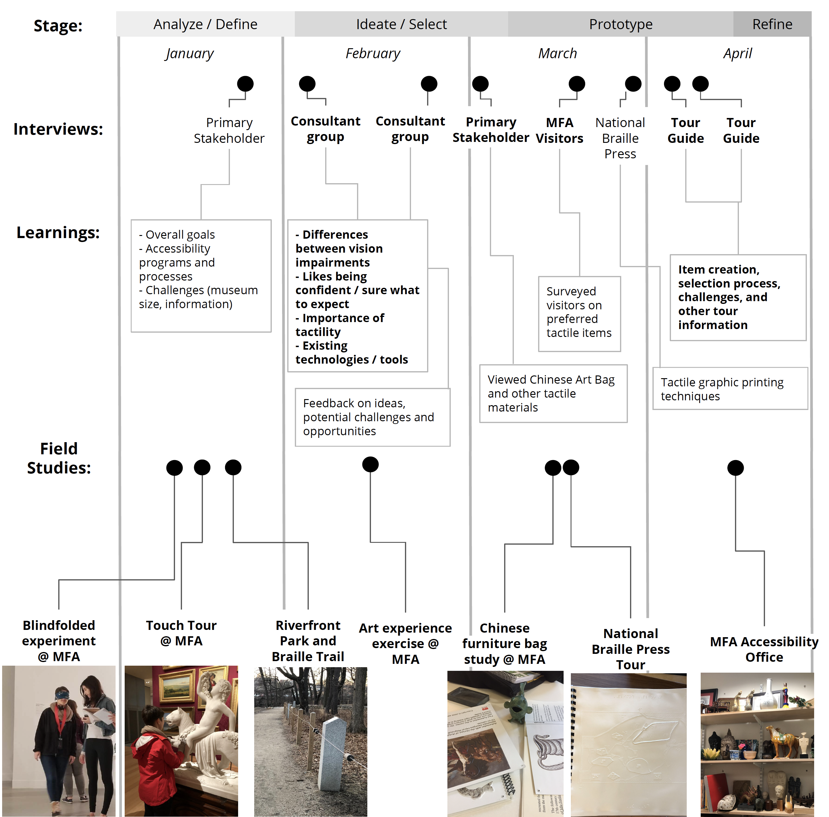 Below is a detailed diagram, starting with our basic timeline - defining what we should be working on at which point in the project - to a breakdown of what we actually did and what we learned from it. Over the four months we worked on this project, we met with a stakeholder or took a trip to collect data almost every week.